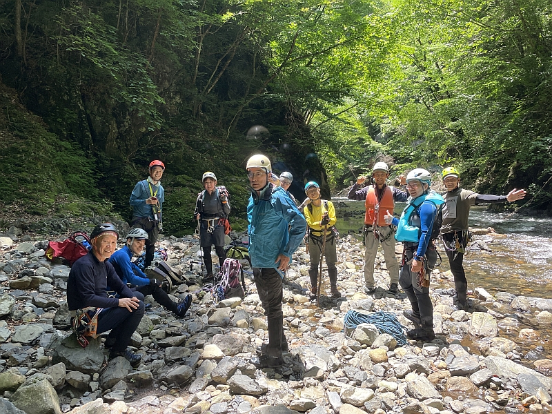 一人渡渉・杖利用の渡渉・スクラム渡渉・ロープを使った渡渉を実施。 休憩のあと、ロープをつかった淵通過、ザックピストン、ラッコ泳ぎ、おしくらまんじゅうを実践した。2時間と少しであったが、体が冷えきった。