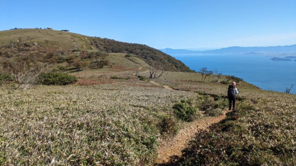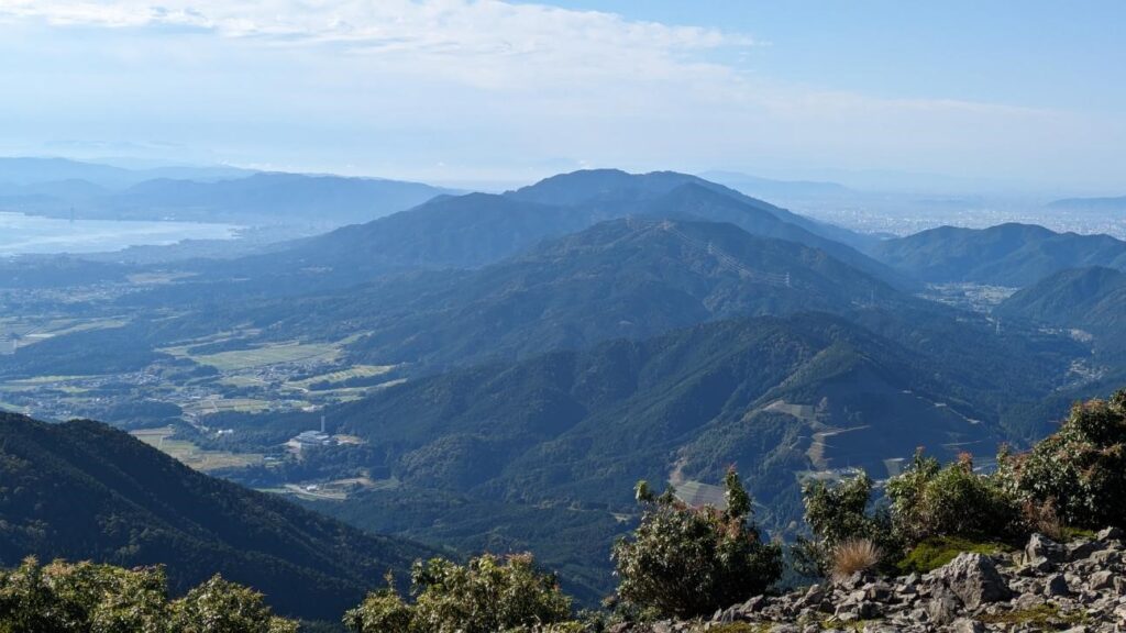 23日:暗いうちに目が覚めましたが天候は良さそうです。今回は行けるところまで行って下るつもりでしたからのんびり朝を食べて6時少し過ぎて出発しました。徐々に道が険しくなり稜線に上がると霊仙山に7時40分到着。東側に琵琶湖の湖面が広がりました。