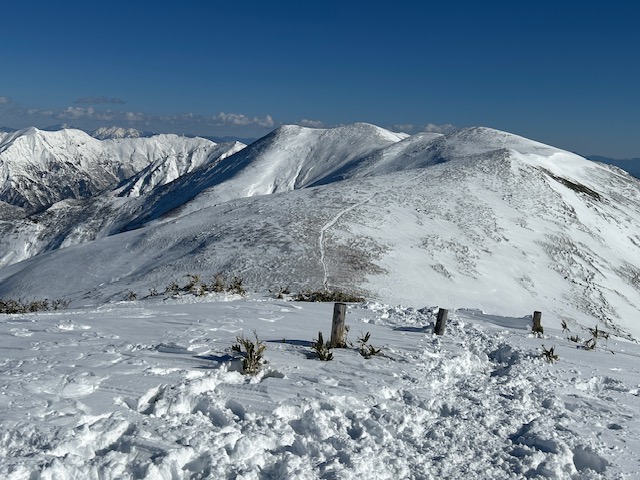 積雪も多くなくトレースもあるのでわかんは必要ない。条件が良いので、仙ノ倉山に足を伸ばす。I崎さんはあややの足取りを見てすでに2合目辺りからそれを予想していたようだ。ところどころ木道が露出している楽しい稜線歩きを楽しむ。仙ノ倉山の吹き溜まりには幕営の名残のブロックがあった。平標山に戻ると登山者もすっかり少なくなっていた。