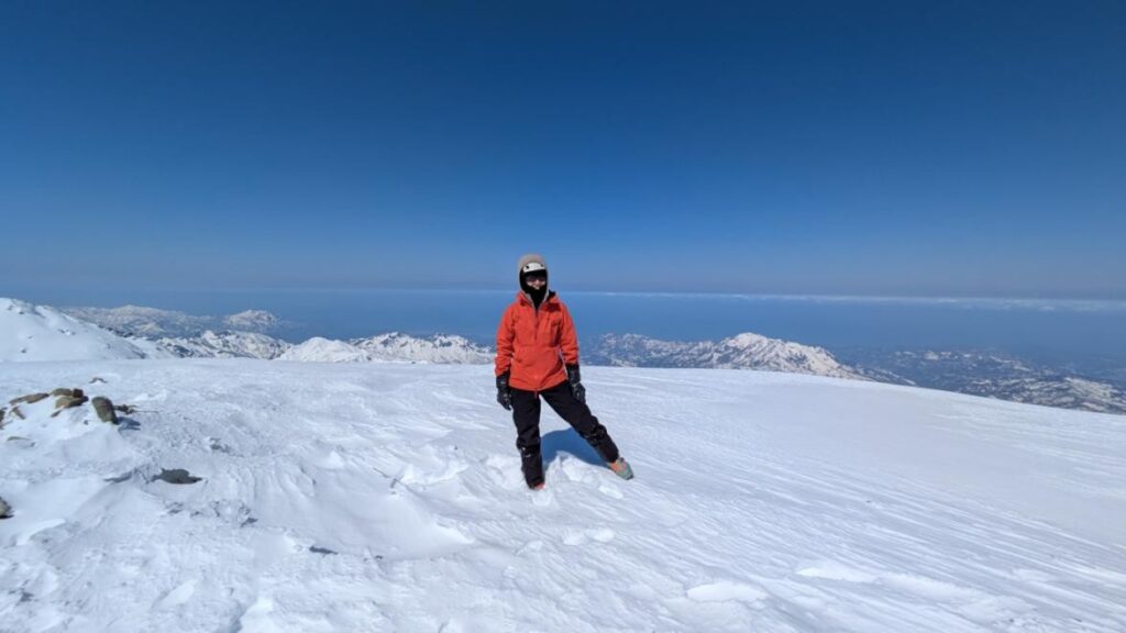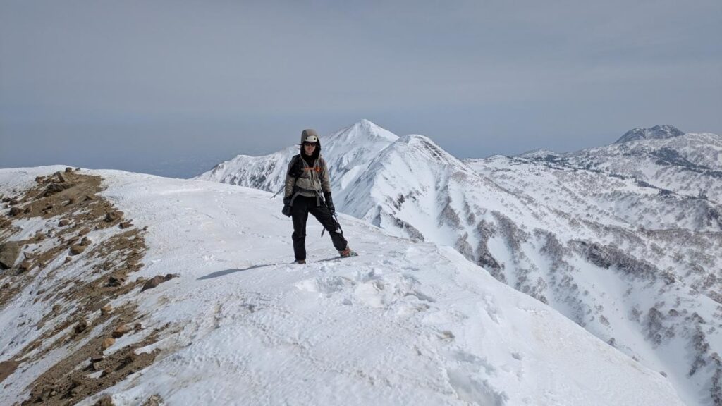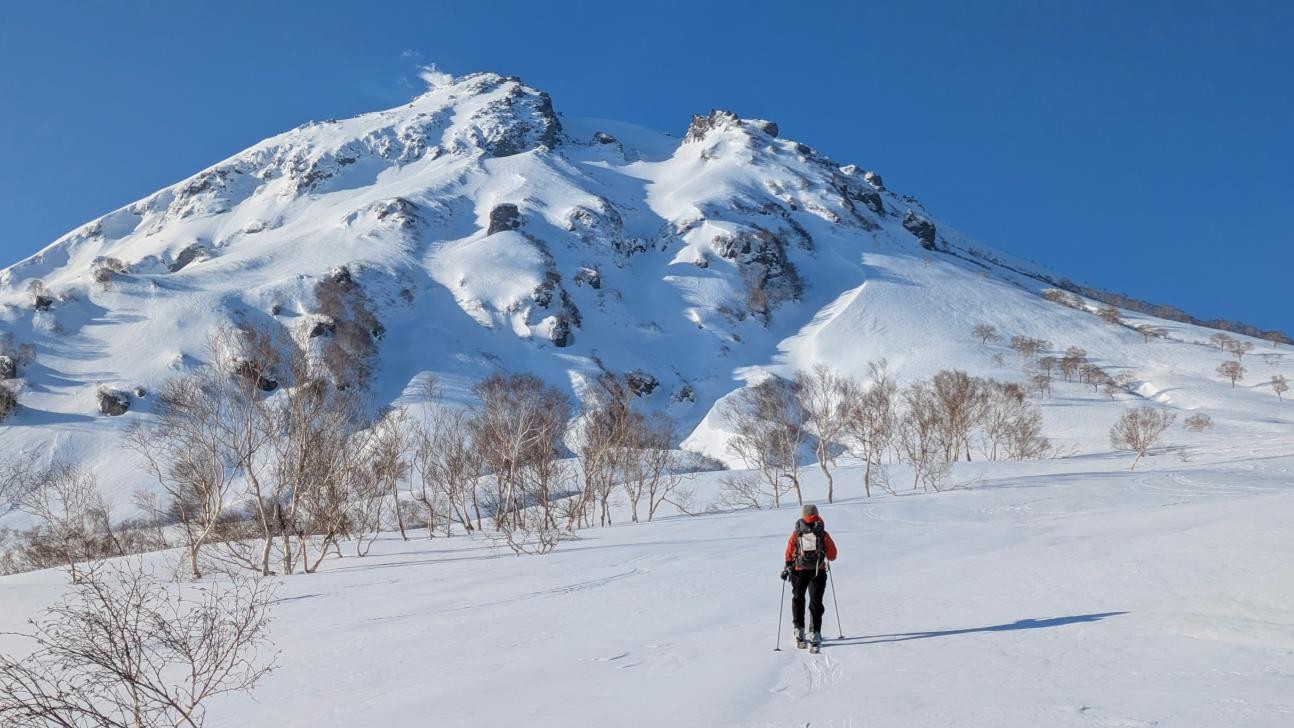 正面に見えるピークを目指して2160mあたりにスキーをデポしてアイゼンで斜面をダイレクトに登ることに。正面のピーク下に着いたのが11時くらいでしたので3時間で山頂に着くと喜んだのですが登ってみると広い斜面の先に一段高いピークが見えてきて間違いに気づきました。正面に見えていたのは2260mピークでした。