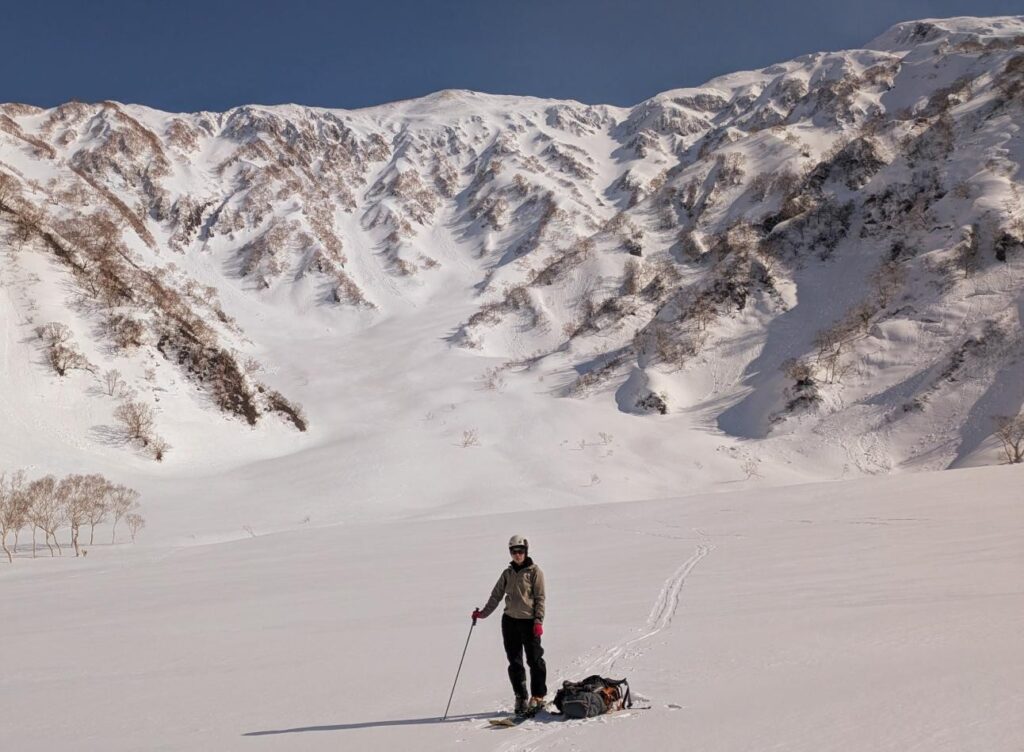 下りをどこにするか相談しましたが登ったルートをクライムダウンすることにしました。空は高曇りになっていたので気温が上がらず緩まなかったのが幸いでした。スキーデポ地にもどりここから長い滑りが続きます。今回初めての快適なスキーです。途中テントを撤収して下りに下って徐々に雪は重たくなりましたが標高460mの笹倉温泉まで滑って16時に今回の山行が終わりました。
